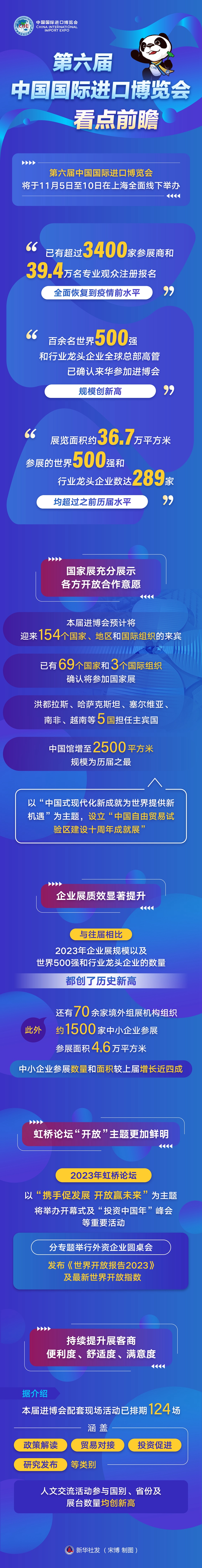 10月23日,国务院新闻办公室在北京举行新闻发布会,请商务部副部长盛秋平、上海市副市长华源、中国国际进口博览局副局长孙成海、上海市商务委员会主任朱民介绍第六届中国国际进口博览会筹备情况,并答记者问。新华社记者 金良快 摄 “已有超过3400家参展商和39.4万名专业观众注册报名,全面恢复到疫情前水平”“百余名世界500强和行业龙头企业全球总部高管已确认来华参加进博会,规模创新高”“展览面积约36.7万平方米,参展的世界500强和行业龙头企业数达289家,均超过之前历届水平”…… 商务部副部长盛秋平在发布会上介绍,目前第六届进博会各项筹备工作已基本就绪。我们将与各方密切配合,全力以赴打造一届高标准、高质量、高水平的全球经贸盛会,为与会各方提供更多市场机遇、投资机遇、增长机遇,凝聚合力,共促发展。 国家展充分展示各方开放合作意愿—— 盛秋平说,本届进博会预计将迎来154个国家、地区和国际组织的来宾;已有69个国家和3个国际组织确认将参加国家展;洪都拉斯、哈萨克斯坦、塞尔维亚、南非、越南等5国担任主宾国;中国馆增至2500平方米,规模为历届之最;以“中国式现代化新成就为世界提供新机遇”为主题,设立“中国自由贸易试验区建设十周年成就展”。 今年是共建“一带一路”倡议提出十周年,共建国家参展情况受到关注。中国国际进口博览局副局长孙成海介绍,国家展的72个参展方中共有64个共建国家。截至目前,共建国家已有超过1500家企业签约第六届进博会企业展,总展览面积近8万平方米,面积较上届增长约30%。 据介绍,对于共建国家中的最不发达国家,进博会通过提供部分免费展位、搭建补贴和展品留购税收优惠政策等方式,推动当地特色产品进入中国市场。 企业展质效显著提升—— 企业展是历届进博会的重头戏。盛秋平介绍,本届进博会能源低碳、人工智能等科技前沿类展览专区以及生活消费类题材展览面积增长30%,超过400项新产品、新技术、新服务将集中展示。全球十五大整车品牌、十大工业电气企业、十大医疗器械企业、三大矿业巨头、四大粮商、五大船运公司等均已确认参展。 孙成海说,与往届相比,今年企业展规模以及世界500强和行业龙头企业的数量都创了历史新高。此外,还有70余家境外组展机构组织约1500家中小企业参展,参展面积4.6万平方米,中小企业参展数量和面积较上届增长近四成。 盛秋平说,前五届进博会展示超过2000项代表性首发新产品、新技术、新服务,累计意向成交额近3500亿美元,助力稳住外贸外资基本盘。今年将组织322家进博会展商走进地方,有力促进“展商变投资商”。 虹桥论坛“开放”主题更加鲜明—— “今年,虹桥论坛将继续聚焦全球开放和经济热点议题,为经济全球化、全球开放合作凝聚更多共识。”盛秋平说。 今年虹桥论坛以“携手促发展 开放赢未来”为主题,将举办开幕式及“投资中国年”峰会等重要活动,分专题举行外资企业圆桌会,发布《世界开放报告2023》及最新世界开放指数。坚持高标准推进,精心组织22场分论坛,全球政商学研界300余位重量级发言嘉宾将出席。 孙成海介绍,论坛紧扣时代热点,设置产业链供应链韧性、数字经济、绿色发展、智能科技、国际标准合作、全球经贸治理等热点议题。国际参与面更广,联合国贸发会议、世界知识产权组织、国际劳工组织等知名国际组织参与主办分论坛。 持续提升展客商便利度、舒适度、满意度—— 据介绍,本届进博会配套现场活动已排期124场,涵盖政策解读、贸易对接、投资促进、研究发布等类别。人文交流活动参与国别、省份及展台数量均创新高。 “这次进博会更加突出智慧和绿色特点。”上海市副市长华源介绍,将充分运用大数据、人工智能等科技手段,优化在电子证件、客流引导、展馆运营管理等方面的应用。推进绿色搭建与出行,持续打造绿色进博、零碳进博、零塑进博。 上海市商务委员会主任朱民说,进一步完善服务保障措施,持续提升展客商便利度、舒适度、满意度。展品入境更加便利,海关出台17条通关便利措施,涵盖参展准入、展品通关、展后处置全流程。