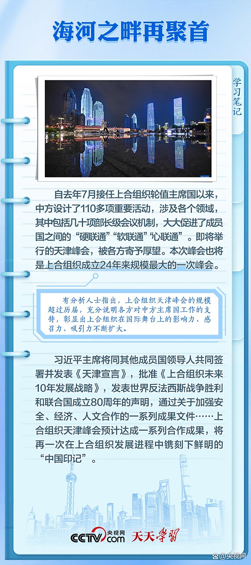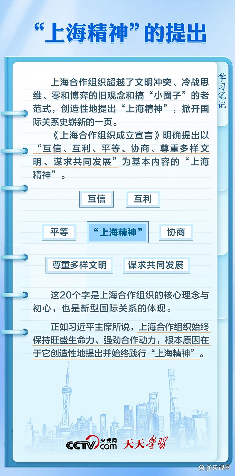 发表时间:2025-08-29 11:43来源:央广网 天天学习8月31日至9月1日,2025年上海合作组织峰会将在天津举行。习近平主席将同20多位外国领导人和10位国际组织负责人聚首海河之滨,出席上合组织成立以来规模最大的一次峰会。 自2013年以来,习近平主席每年都会出席上合组织峰会并发表重要讲话,每次讲话都会谈到“上海精神”。什么是“上海精神”?这一精神为何能成为上合组织的“发展密码”?央视网《天天学习》栏目与您一起学习了解。