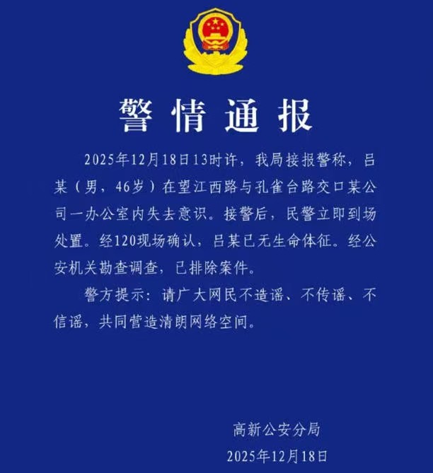发表时间:2025-12-19 17:07来源:网络 12月18日晚间,合肥高新公安分局率先通过官方微博发布警情通报,明确46岁的吕某(即吕品)于当日13时许,在望江西路与孔雀台路交口某公司办公室内失去意识,经120现场确认已无生命体征,公安机关经勘查调查后排除案件可能。通报提及的办公地点,与国盾量子及其中电信量子信息科技集团有限公司的办公区域高度吻合,印证了逝者身份。