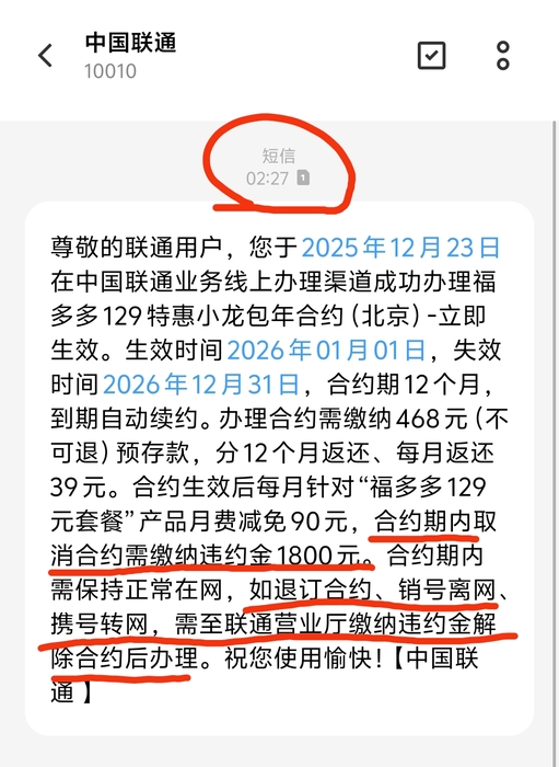 近日,北京联通用户反映,在2025年12月23日早晨醒来看到联通凌晨2:27给自己发短信,被告知自己在联通线上渠道已成功办理“福多多129特惠小龙包年合约(北京)”业务,取消的话需要缴纳1800元违约金。用户直呼“遭遇强买强卖”。