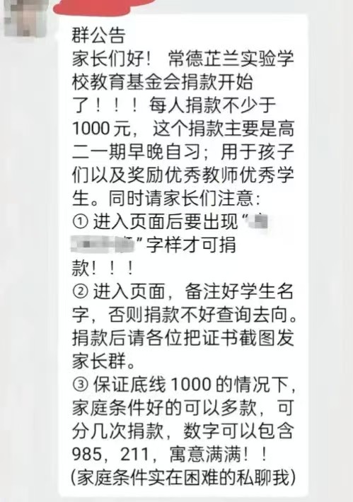 近日,一则常德芷兰实验学校教育基金会的捐款通知在社交平台引发热议。通知中明确要求家长每人捐款不少于1000元,还暗示家庭条件好的可多捐,数字可包含985、211等寓意,仅对“实在困难”的家庭开放私聊申请例外。此举被指违背教育公益的初衷,更触碰了捐款自愿、公立学校办学规范的多条红线。